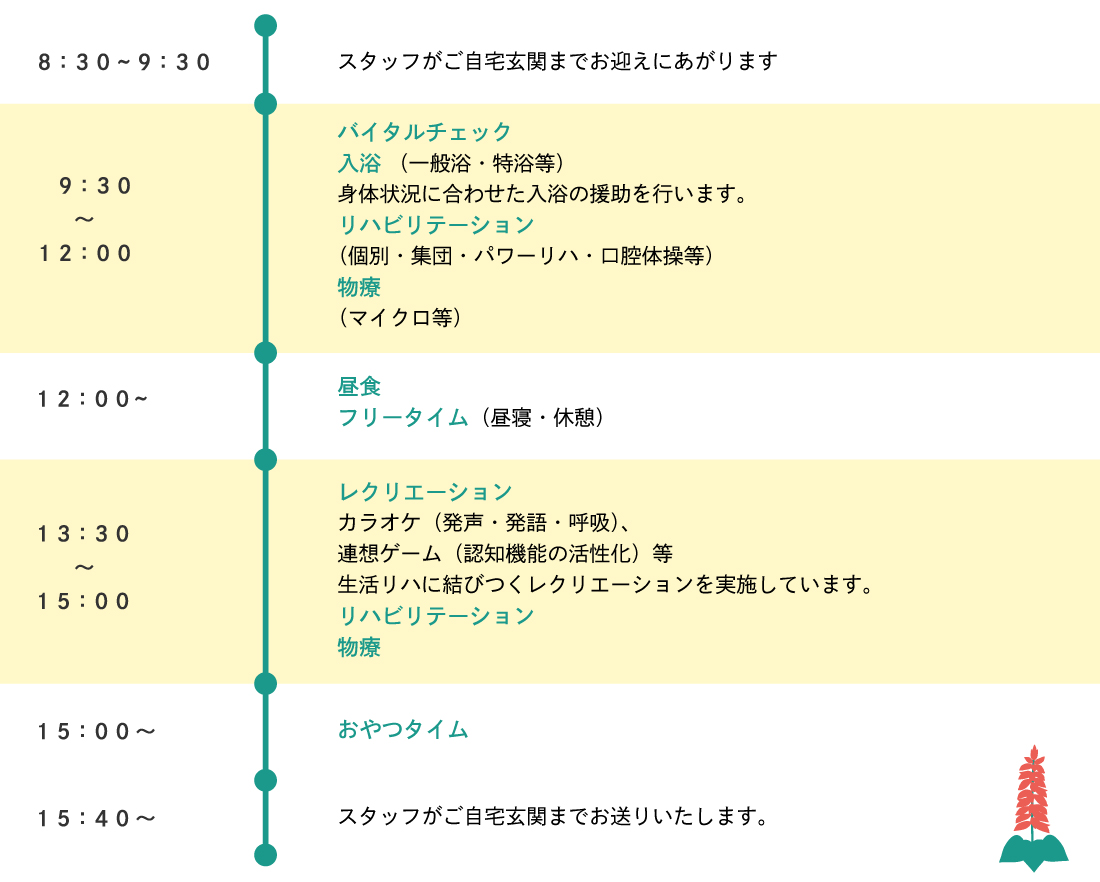ご家庭から通いながらリハビリテーション、趣味活動を行い健康の維持・増進を図ります。ご希望により、送迎、食事、入浴サービスを提供いたします。